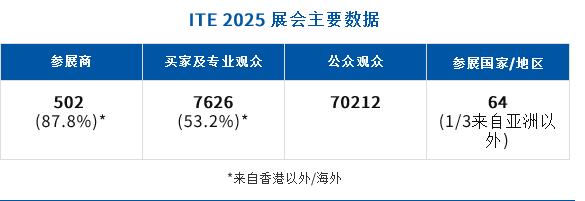 上届ITE 2025汇聚502家参展商(88%来自香港以外地区)来自64国家及地区,吸引7,626买家及专业观众(约70%来自大湾区、20%来自海外),公众日录得70,212入场人次 (主要为高端自由行客)。