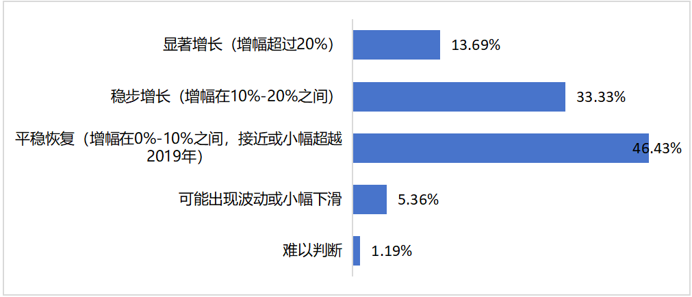 对于2026年中国出境旅游市场的表现,近半业者(46.43%)认为2026年中国出境旅游市场将呈现平稳恢复态势,增幅预计在0%-10%之间,市场有望接近或小幅超越2019年水平。另有33.33%的运营商预期市场将实现稳步增长,增幅介于10%-20%之间。整体来看,业界对2026年持谨慎乐观态度,预计出境游市场将在波动中持续回暖。